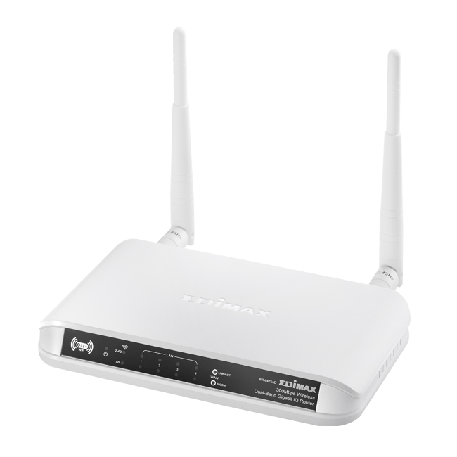 The Edimax BR-6475nD is a high-speed solution that complies with IEEE 802.11a/b/g/n standards. The latest wireless technology is built into this iQ router to broaden its wireless coverage by 5 times and to reduce dead spots within the wireless range. When it is connected to wireless 802.11n compatible devices, the BR-6475nD can achieve transmission rates of up to 300Mbps on both 5GHz and 2.4GHz bands.