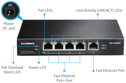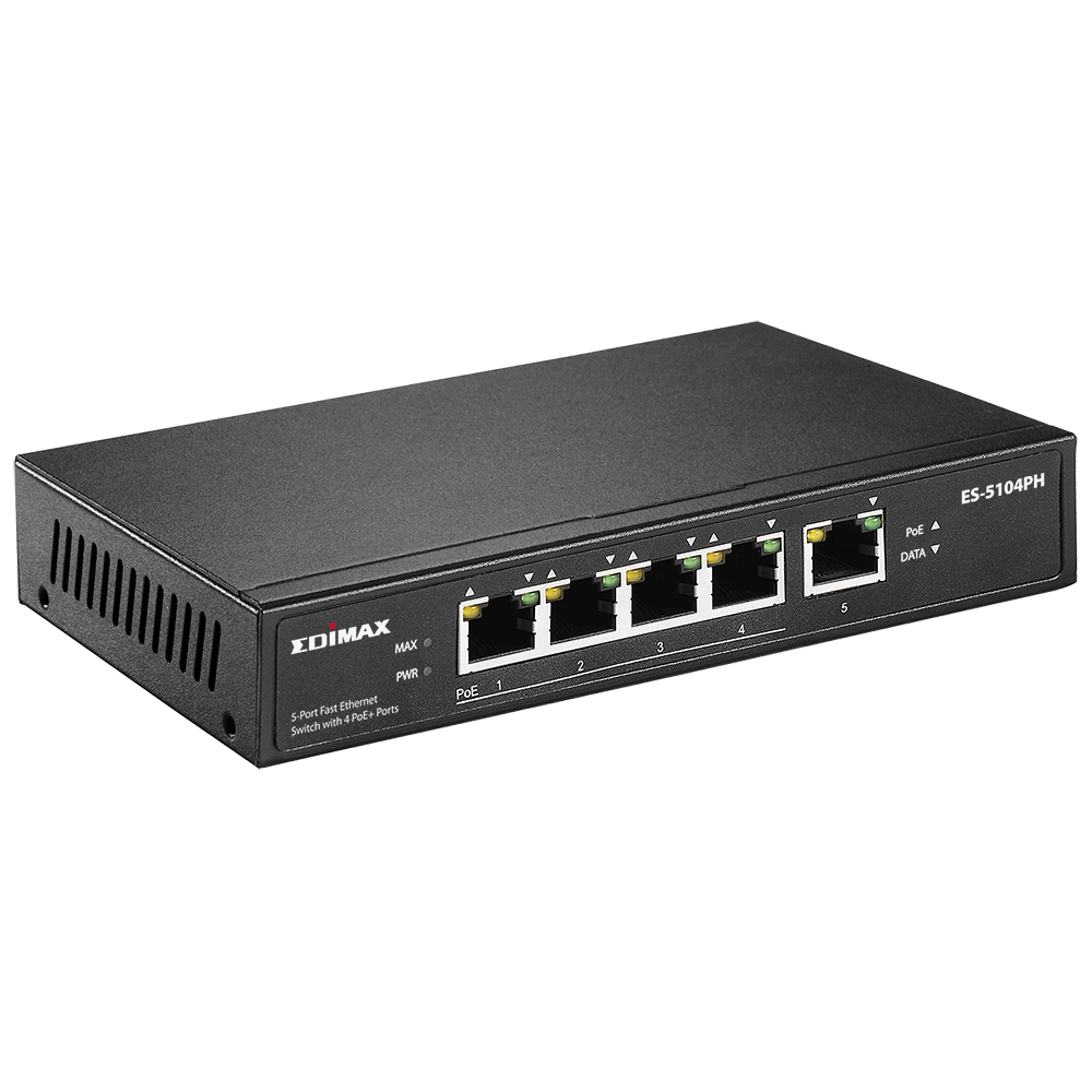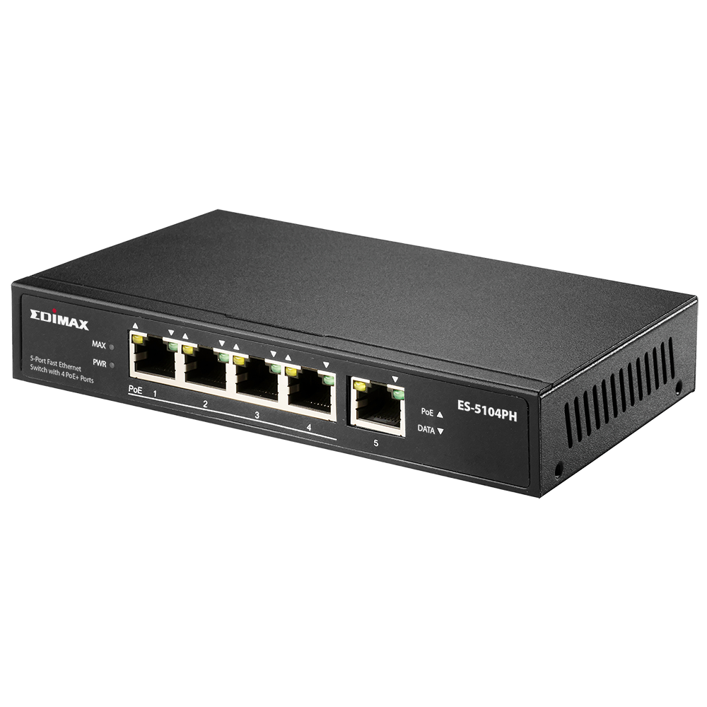 The Edimax ES-5104PH is a five Port Fast Ethernet switch with four PoE+ Ports designed for use in home, small or medium sized network environments. It easily connects and supplies power to PoE-enabled devices such as wireless access points, network cameras and IP phones as well as other Ethernet-enabled devices such as computers, printers and network attached storage (NAS). The device's compact size and fan-less design make it an ideal solution for expanding home and small business networks.