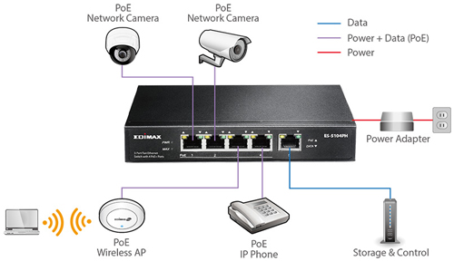 Just plug Ethernet or PoE enabled devices into the switch. Data and power can be transmitted through existing standard Cat-5e Ethernet cables with no additional cables or configuration required. The ES-5104PH reduces the difficulty, time and cost of network setup.
