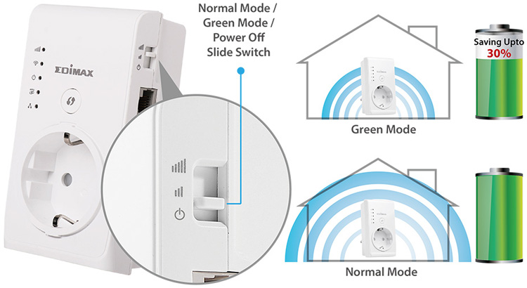 EW-7438PTn je vybaven přepínačem bezdrátové sítě, který umožňuje jednoduše změni sílu signálu bezdrátové sítě nebo její vypnutí. Snížení výkonu snižuje spotřebu energiee až o 25%.