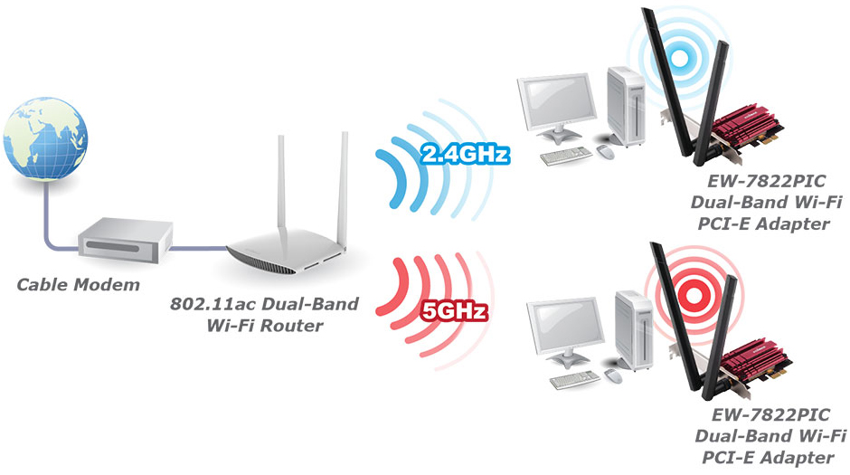 Bezdrátový standard nové generace 802.11ac znamená revoluci WiFi připojení. Na trhu jsou již dostupné dvoupásmové routery, ale většina síťových adaptérů podporuje pouze standard 802.11n. EW-7811PIC umožňuje připojení k takovým routerům rovněž v pásmu 5GHz. Adaptér je zpětně kompatibilní se standardy 802.11a/b/g/n.